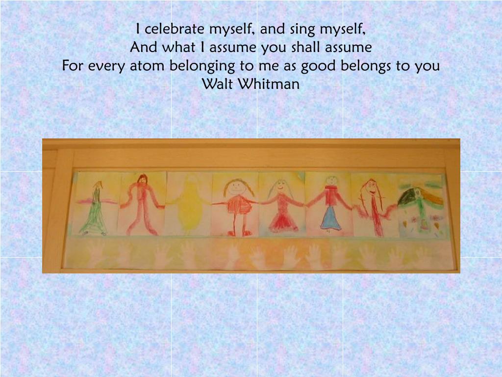 I celebrate myself, and sing myself,And what I assume you shall assumeFor every atom belonging to me as good belongs to youWalt Whitman