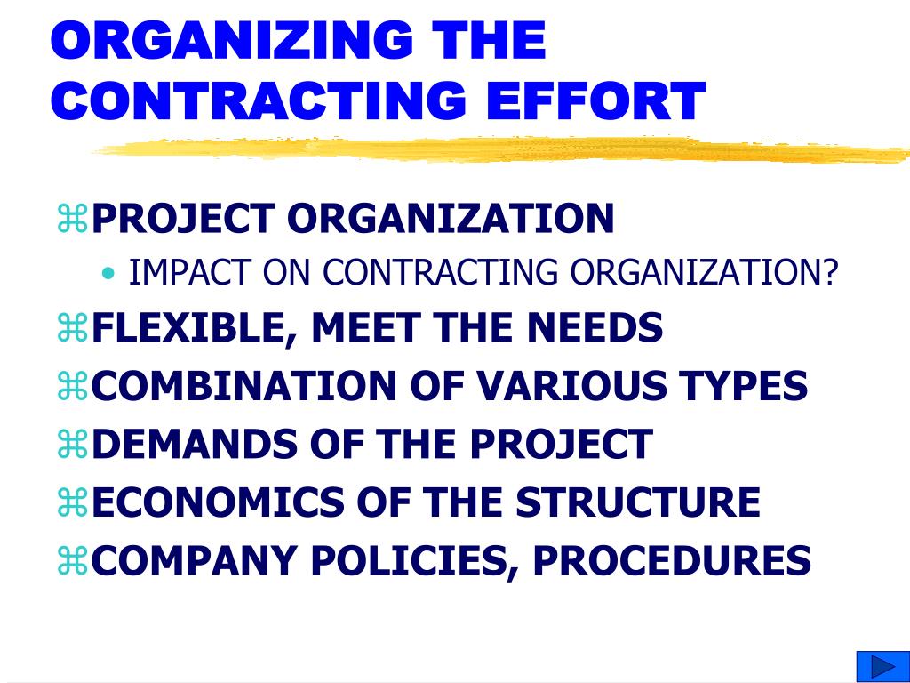 ORGANIZING THE CONTRACTING EFFORT • PROJECT ORGANIZATION • IMPACT ON CONTRACTING ORGANIZATION? • FLEXIBLE, MEET THE NEEDS • COMBINATION OF VARIOUS TYPES • DEMANDS OF THE PROJECT • ECONOMICS OF THE STRUCTURE • COMPANY POLICIES, PROCEDURES