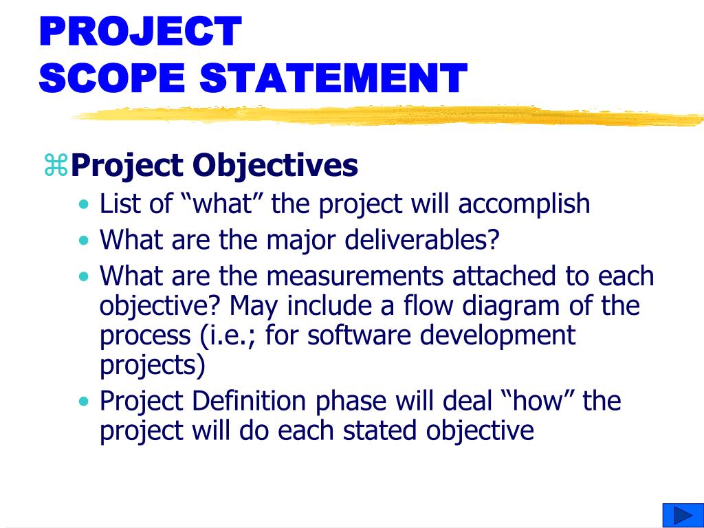 PROJECT SCOPE STATEMENT • Project Objectives • List of “what” the project will accomplish • What are the major deliverables? • What are the measurements attached to each objective? May include a flow diagram of the process (i.e.; for software development projects) • Project Definition phase will deal “how” the project will do each stated objective