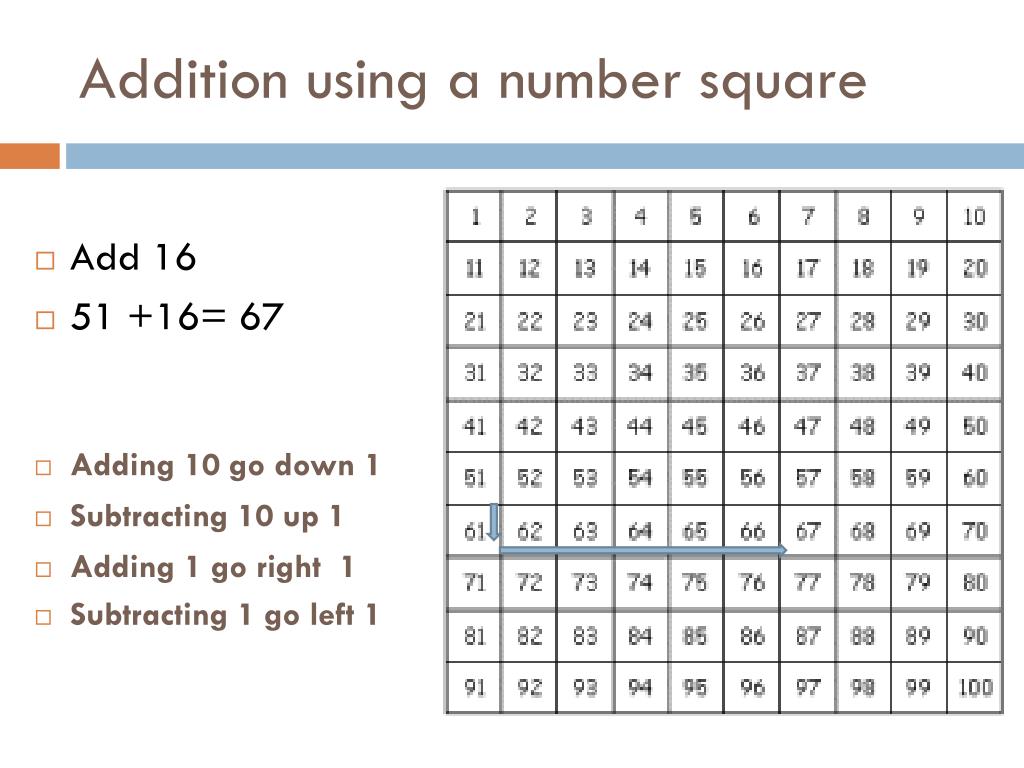 Addition using a number square • Add 16 • 51 +16= 67 • Adding 10 go down 1 • Subtracting 10 up 1 • Adding 1 go right 1 • Subtracting 1 go left 1