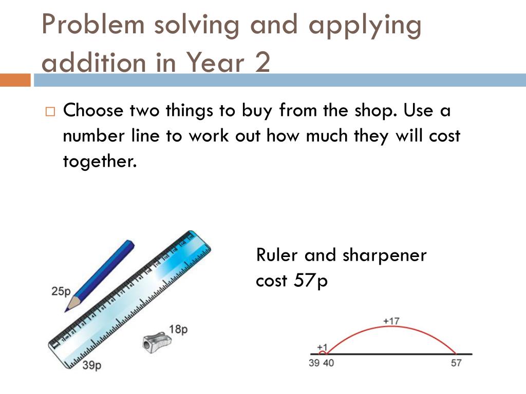 Problem solving and applying addition in Year 2 • Choose two things to buy from the shop. Use a number line to work out how much they will cost together. Ruler and sharpener cost 57p