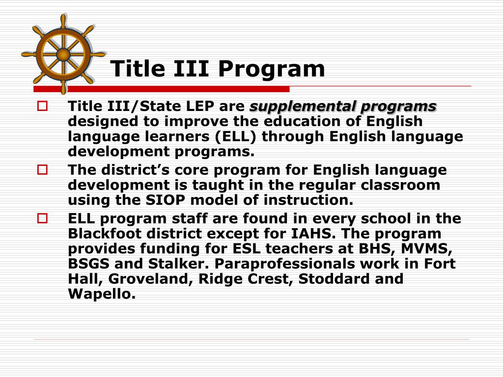 Title III Program • Title III/State LEP are supplemental programs designed to improve the education of English language learners (ELL) through English language development programs. • The district’s core program for English language development is taught in the regular classroom using the SIOP model of instruction. • ELL program staff are found in every school in the Blackfoot district except for IAHS. The program provides funding for ESL teachers at BHS, MVMS, BSGS and Stalker. Paraprofessionals work in Fort Hall, Groveland, Ridge Crest, Stoddard and Wapello.