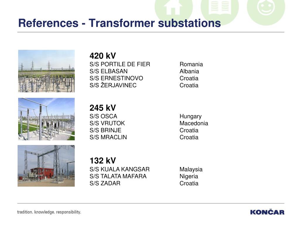References - Transformer substations • 420 kV • S/S PORTILE DE FIER Romania • S/S ELBASAN Albania • S/S ERNESTINOVO Croatia • S/S ŽERJAVINEC Croatia • 245 kV • S/S OSCA Hungary • S/S VRUTOK Macedonia • S/S BRINJE Croatia • S/S MRACLIN Croatia • 132 kV • S/S KUALA KANGSAR Malaysia • S/S TALATA MAFARA Nigeria • S/S ZADAR Croatia