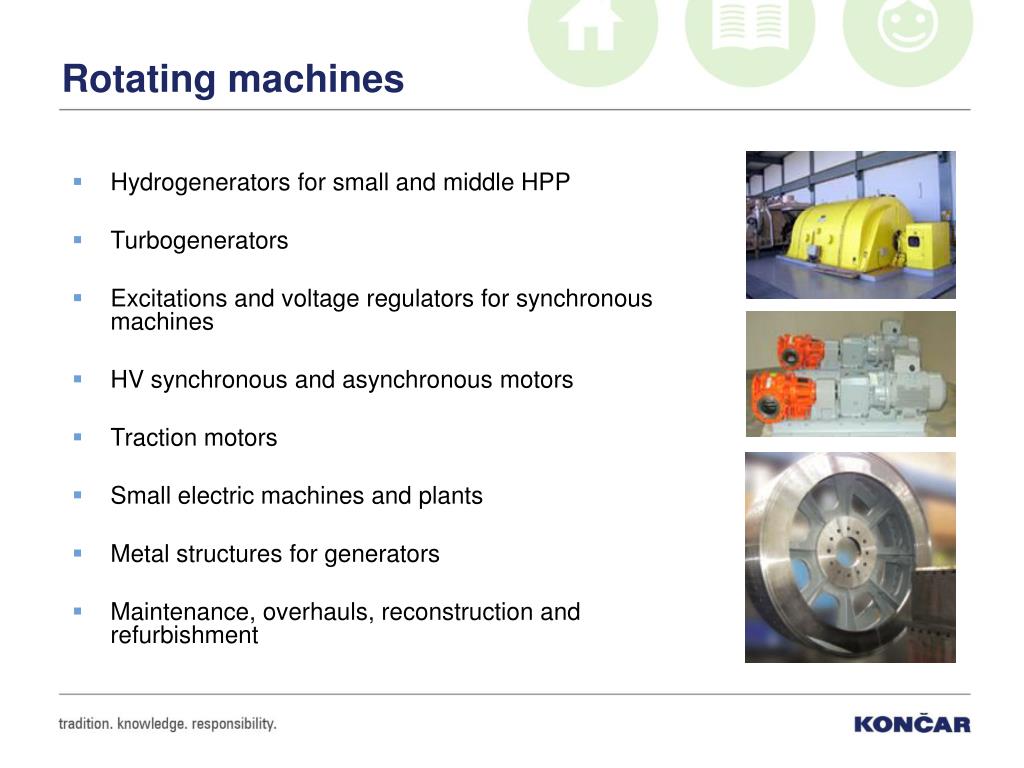 Rotating machines • Hydrogenerators for small and middle HPP • Turbogenerators • Excitations and voltage regulators for synchronous machines • HV synchronous and asynchronous motors • Traction motors • Small electric machines and plants • Metal structures for generators • Maintenance, overhauls, reconstruction and refurbishment