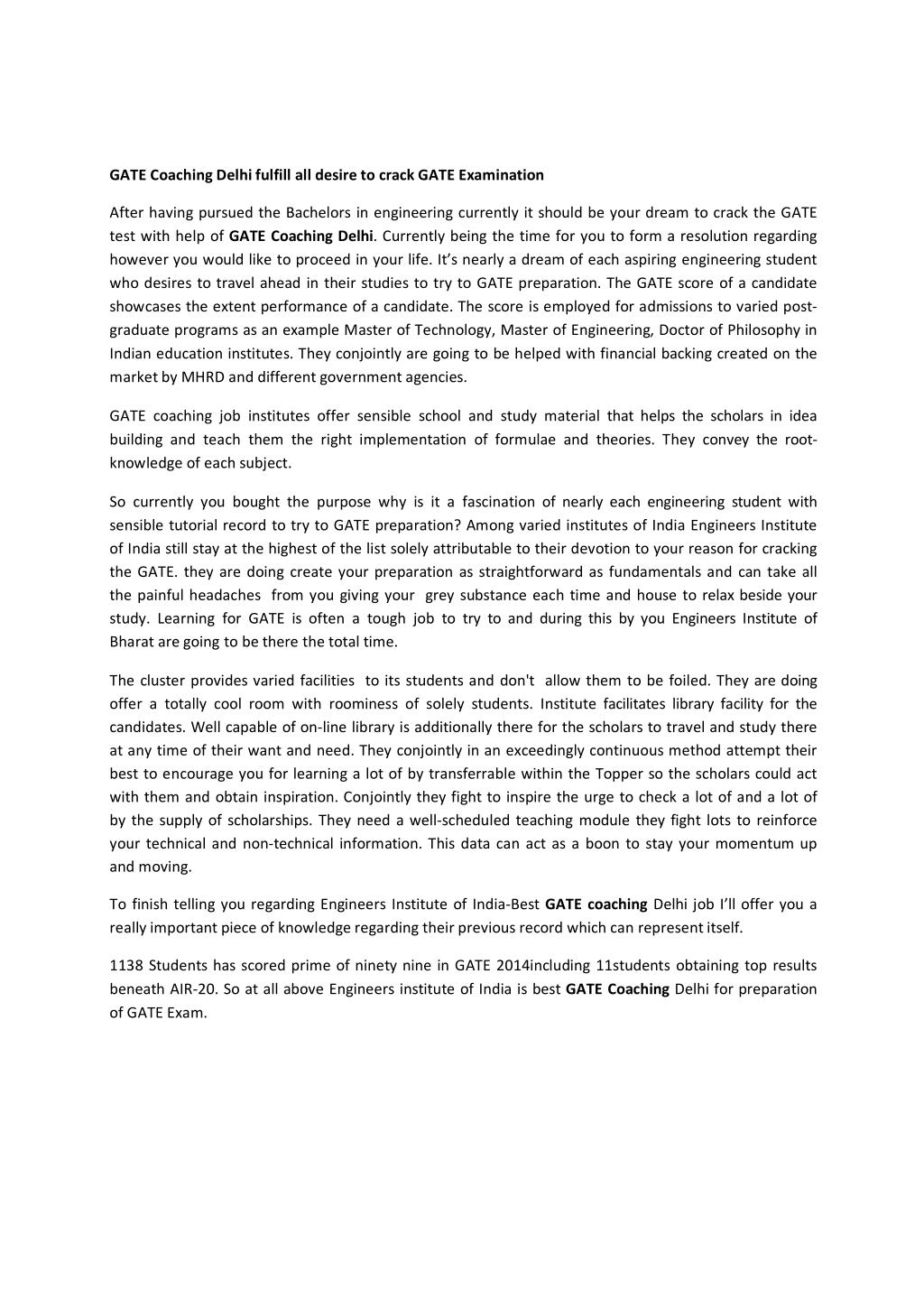 GATECoachingDelhifulfillalldesiretocrackGATEExamination AfterhavingpursuedtheBachelorsinengineeringcurrentlyitshouldbeyourdreamtocracktheGATE testwithhelpofGATECoachingDelhi.Currentlybeingthetimeforyoutoformaresolutionregarding howeveryouwouldliketoproceedinyourlife.It’snearlyadreamofeachaspiringengineeringstudent whodesirestotravelaheadintheirstudiestotrytoGATEpreparation.TheGATEscoreofacandidate showcasestheextentperformanceofacandidate.Thescoreisemployedforadmissionstovariedpost-graduateprogramsasanexampleMasterofTechnology,MasterofEngineering,DoctorofPhilosophyinIndianeducationinstitutes.TheyconjointlyaregoingtobehelpedwithfinancialbackingcreatedonthemarketbyMHRDanddifferentgovernmentagencies. GATEcoachingjobinstitutesoffersensibleschoolandstudymaterialthathelpsthescholarsinidea buildingandteachthemtherightimplementationofformulaeandtheories.Theyconveytheroot- knowledgeofeachsubject. Socurrentlyyouboughtthepurposewhyisitafascinationofnearlyeachengineeringstudentwith sensibletutorialrecordtotrytoGATEpreparation?AmongvariedinstitutesofIndiaEngineersInstituteofIndiastillstayatthehighestofthelistsolelyattributabletotheirdevotiontoyourreasonforcracking theGATE.theyaredoingcreateyourpreparationasstraightforwardasfundamentalsandcantakeall thepainfulheadachesfromyougivingyourgreysubstanceeachtimeandhousetorelaxbesideyour study.LearningforGATEisoftenatoughjobtotrytoandduringthisbyyouEngineersInstituteof Bharataregoingtobetherethetotaltime. Theclusterprovidesvariedfacilitiestoitsstudentsanddon'tallowthemtobefoiled.Theyaredoingofferatotallycoolroomwithroominessofsolelystudents.Institutefacilitateslibraryfacilityforthe candidates.Wellcapableofon-linelibraryisadditionallythereforthescholarstotravelandstudythere atanytimeoftheirwantandneed.Theyconjointlyinanexceedinglycontinuousmethodattempttheir besttoencourageyouforlearningalotofbytransferrablewithintheToppersothescholarscouldact withthemandobtaininspiration.Conjointlytheyfighttoinspiretheurgetocheckalotofandalotof bythesupplyofscholarships.Theyneedawell-scheduledteachingmoduletheyfightlotstoreinforceyourtechnicalandnon-technicalinformation.Thisdatacanactasaboontostayyourmomentumup andmoving. TofinishtellingyouregardingEngineersInstituteofIndia-BestGATEcoachingDelhijobI’llofferyouareallyimportantpieceofknowledgeregardingtheirpreviousrecordwhichcanrepresentitself. 1138StudentshasscoredprimeofninetynineinGATE2014including11studentsobtainingtopresults beneathAIR-20.SoatallaboveEngineersinstituteofIndiaisbestGATECoachingDelhiforpreparationofGATEExam.