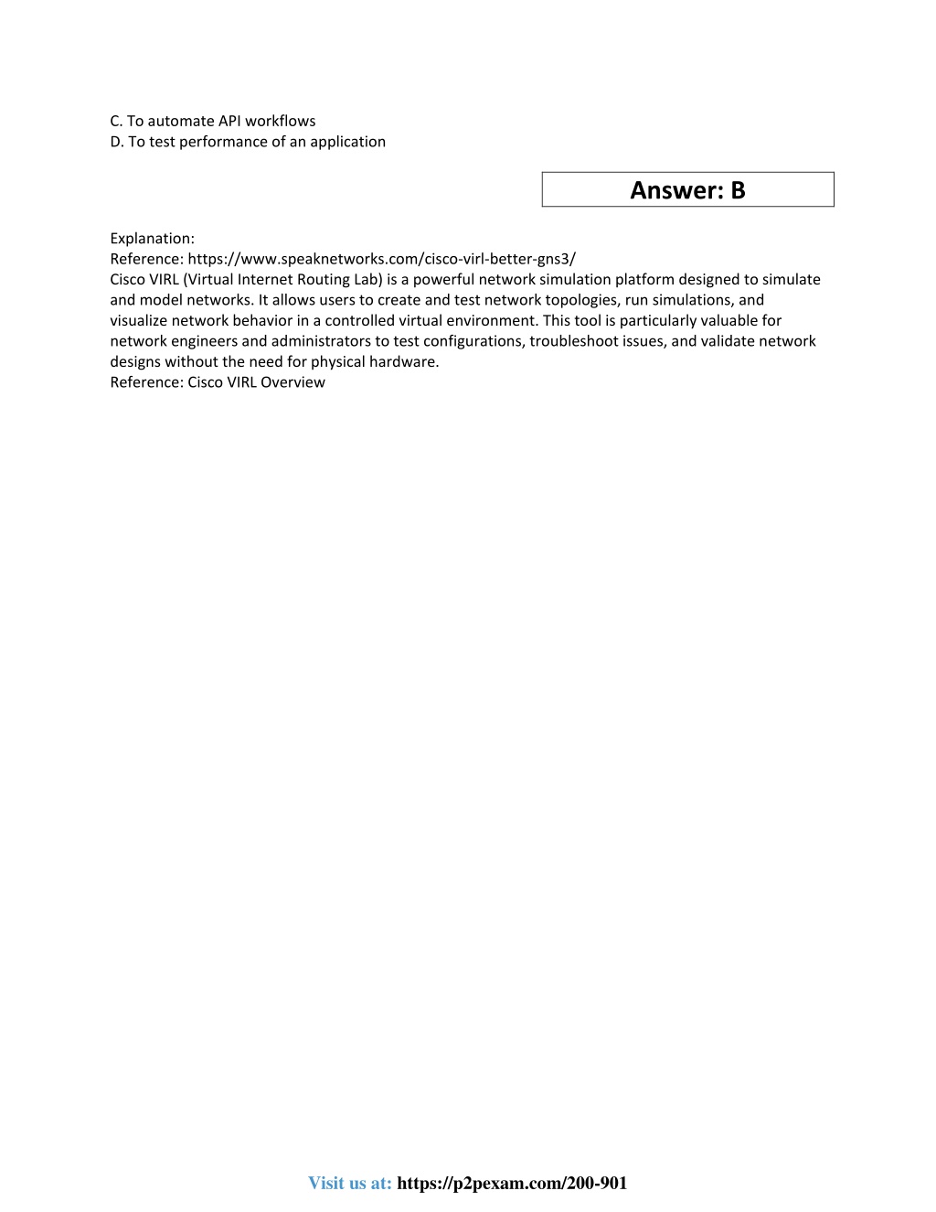 C. To automate API workflows D. To test performance of an application Answer: B Explanation: Reference: https://www.speaknetworks.com/cisco-virl-better-gns3/ Cisco VIRL (Virtual Internet Routing Lab) is a powerful network simulation platform designed to simulate and model networks. It allows users to create and test network topologies, run simulations, and visualize network behavior in a controlled virtual environment. This tool is particularly valuable for network engineers and administrators to test configurations, troubleshoot issues, and validate network designs without the need for physical hardware. Reference: Cisco VIRL Overview Visit us at: https://p2pexam.com/200-901