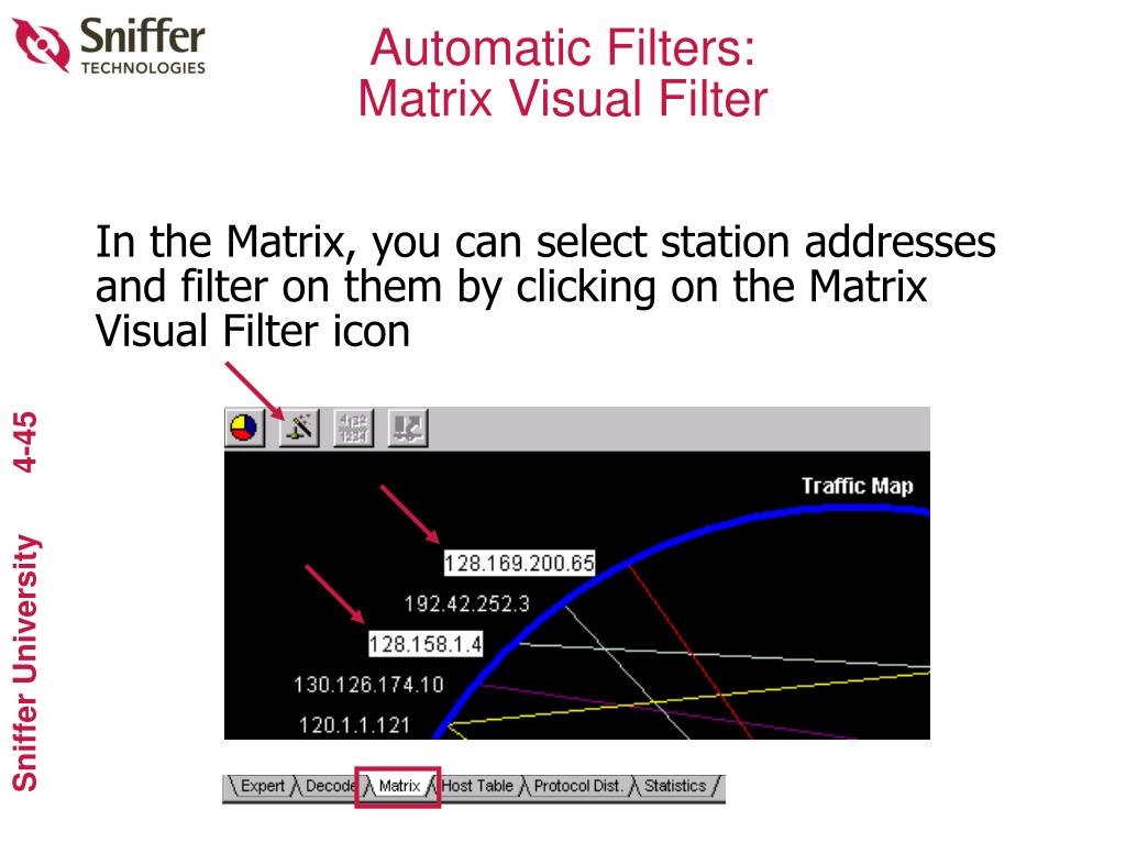 Display Filters • Use display filters to eliminate frames from view or to isolate a specific conversation • When you apply a display filter, Sniffer Portable will default to create a Filtered (x) window attached to the original trace • There are 3 options to create a separate filtered window • You may apply display filters using • Filter profiles (named filters) • Automatic filters • “Quick” filters