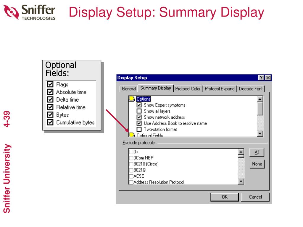 Display Setup • Display Setup allows you to customize the Summary Display, Protocol Color, Protocol Expansion, and the font for protocoldecodes • From the Menu bar choose Display > Display Setup...