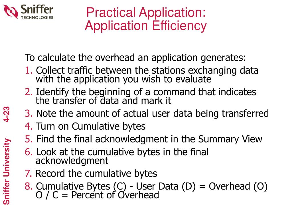 Practical Application:Application Efficiency To calculate the overhead an application generates: 1. Collect traffic between the stations exchanging data with the application you wish to evaluate 2. Identify the beginning of a command that indicates the transfer of data and mark it 3. Note the amount of actual user data being transferred 4. Turn on Cumulative bytes 5. Find the final acknowledgment in the Summary View 6. Look at the cumulative bytes in the final acknowledgment 7. Record the cumulative bytes 8. Cumulative Bytes (C) - User Data (D) = Overhead (O) O / C = Percent of Overhead