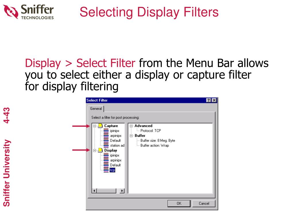 Selecting Display Filters Display > Select Filter from the Menu Bar allows you to select either a display or capture filter for display filtering