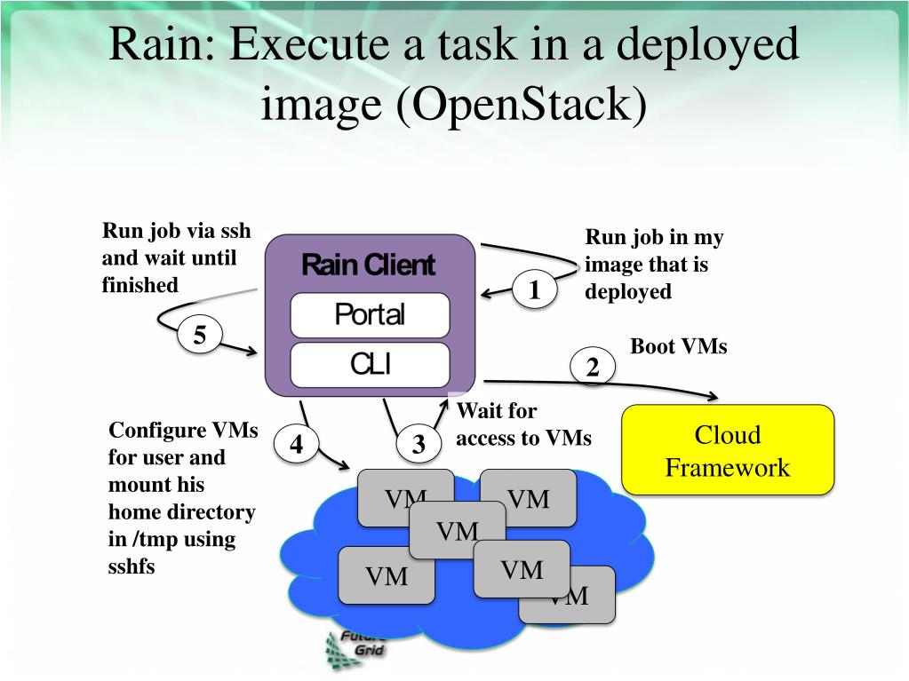 Rain: Execute a task in a deployed image (OpenStack) Run job via ssh and wait until finished Run job in my image that is deployed 1 5 Boot VMs 2 Wait for access to VMs Cloud Framework Configure VMs for user and mount his home directory in /tmp using sshfs 4 3 VM VM VM VM VM VM