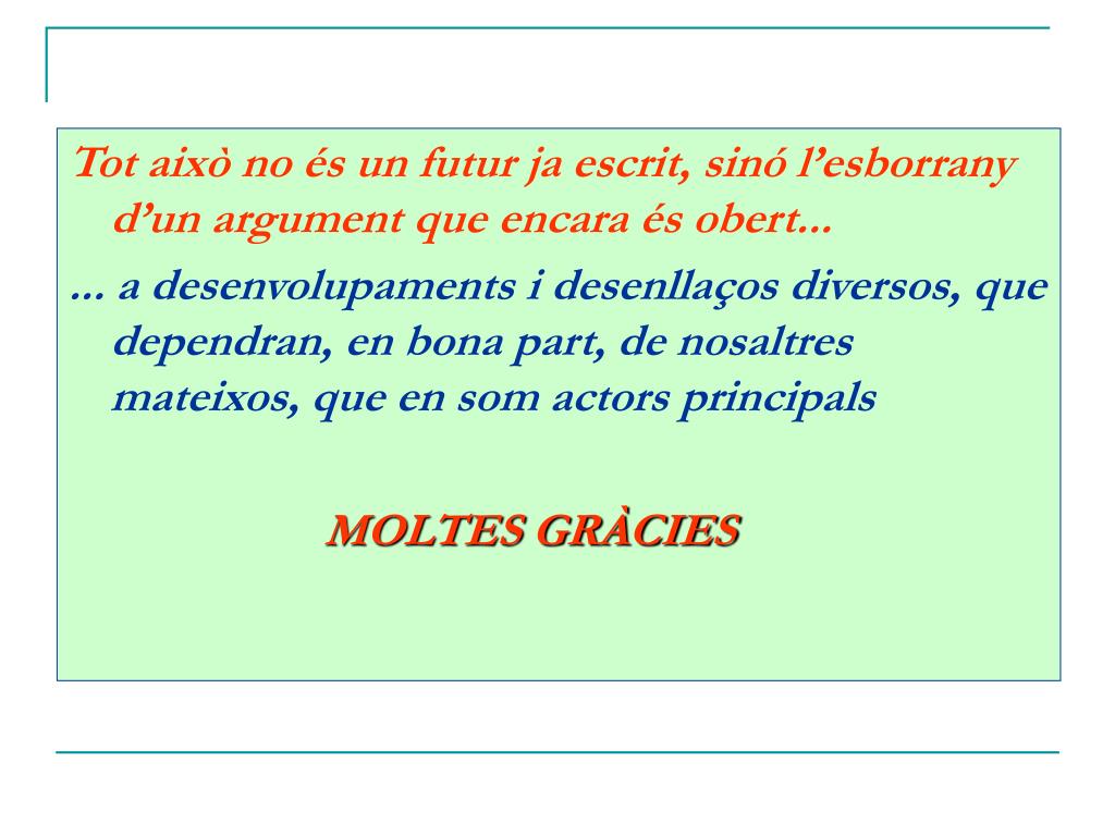 Tot això no és un futur ja escrit, sinó l’esborrany d’un argument que encara és obert... ... a desenvolupaments i desenllaços diversos, que dependran, en bona part, de nosaltres mateixos, que en som actors principals MOLTES GRÀCIES