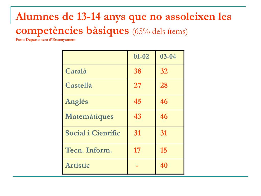 Alumnes de 13-14 anys que no assoleixen les competències bàsiques (65% dels ítems)Font: Departament d’Ensenyament