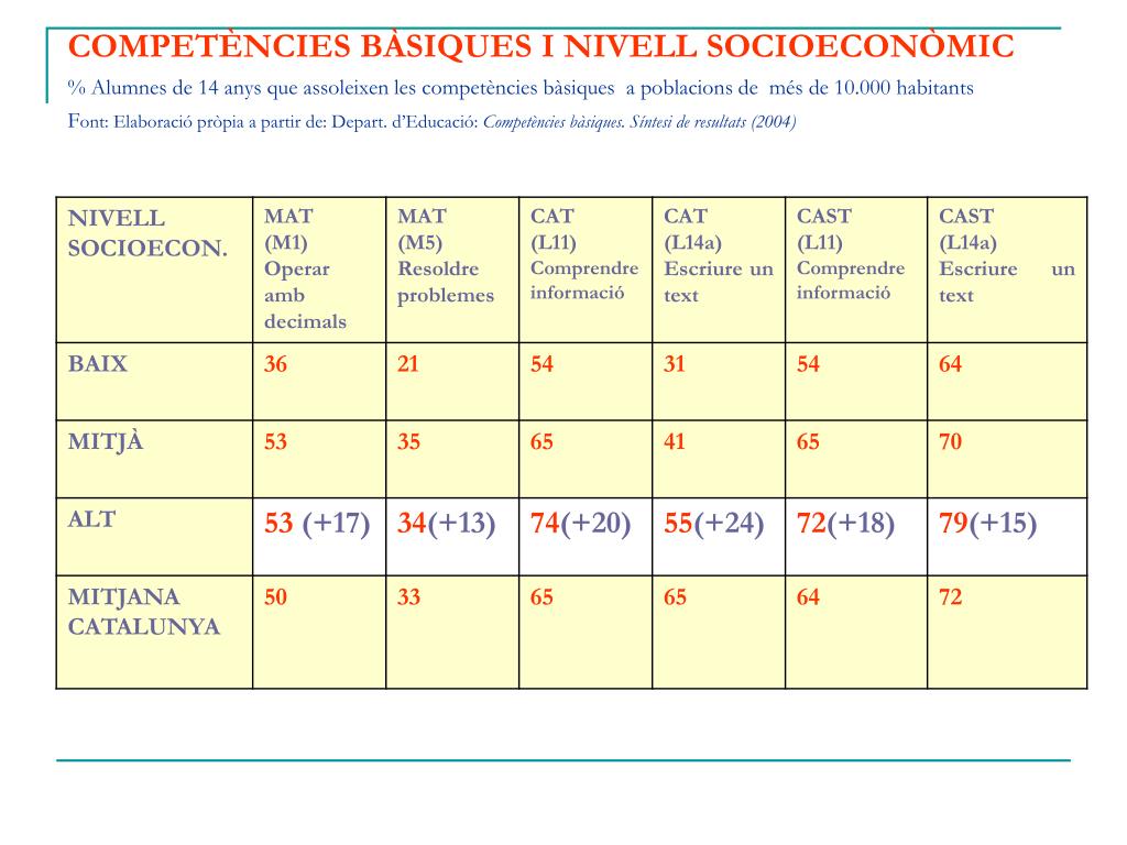 COMPETÈNCIES BÀSIQUES I NIVELL SOCIOECONÒMIC% Alumnes de 14 anys que assoleixen les competències bàsiques a poblacions de més de 10.000 habitantsFont: Elaboració pròpia a partir de: Depart. d’Educació: Competències bàsiques. Síntesi de resultats (2004)