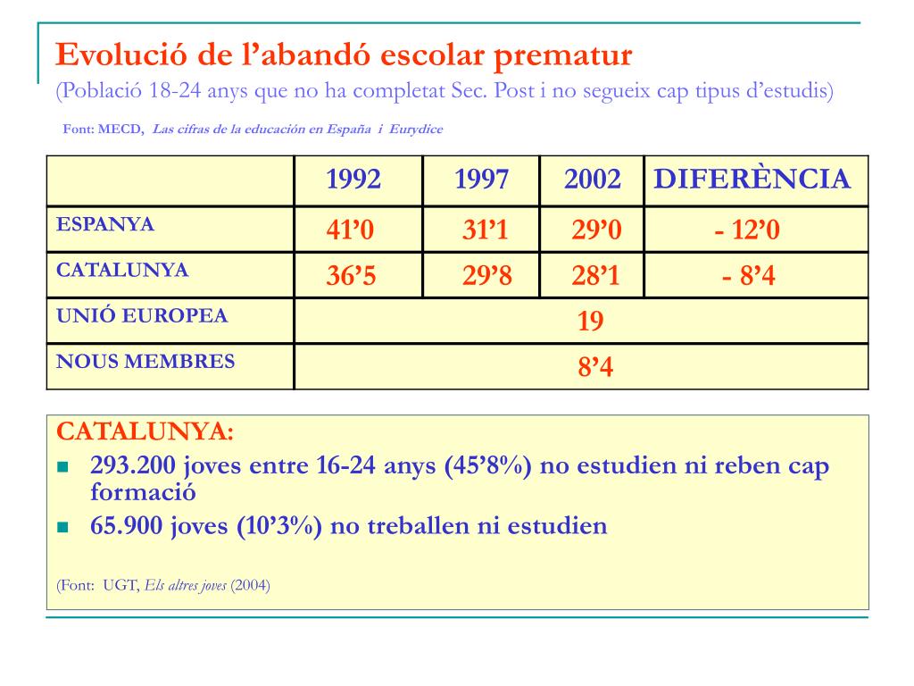 Evolució de l’abandó escolar prematur(Població 18-24 anys que no ha completat Sec. Post i no segueix cap tipus d’estudis)Font: MECD, Las cifras de la educación en España i Eurydice CATALUNYA: • 293.200 joves entre 16-24 anys (45’8%) no estudien ni reben cap formació • 65.900 joves (10’3%) no treballen ni estudien (Font: UGT, Els altres joves (2004)