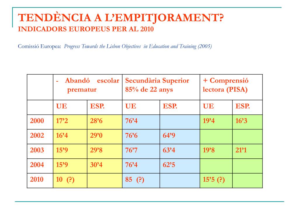 TENDÈNCIA A L’EMPITJORAMENT?INDICADORS EUROPEUS PER AL 2010Comissió Europea: Progress Towards the Lisbon Objectives in Education and Training (2005)