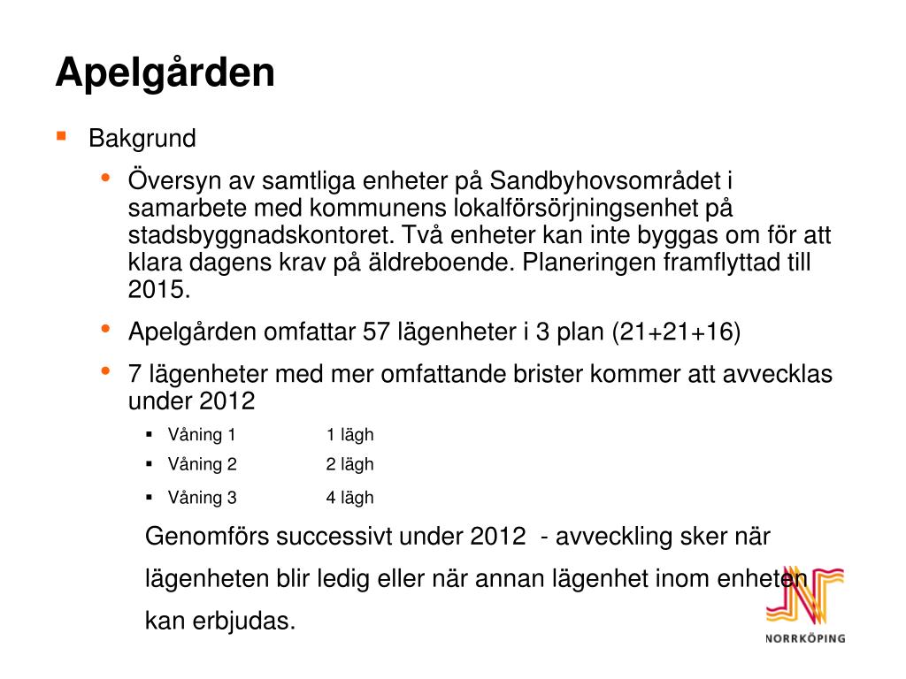 Apelgården • Bakgrund • Översyn av samtliga enheter på Sandbyhovsområdet i samarbete med kommunens lokalförsörjningsenhet på stadsbyggnadskontoret. Två enheter kan inte byggas om för att klara dagens krav på äldreboende. Planeringen framflyttad till 2015. • Apelgården omfattar 57 lägenheter i 3 plan (21+21+16) • 7 lägenheter med mer omfattande brister kommer att avvecklas under 2012 • Våning 1 1 lägh • Våning 2 2 lägh • Våning 3 4 lägh Genomförs successivt under 2012 - avveckling sker när lägenheten blir ledig eller när annan lägenhet inom enheten kan erbjudas.