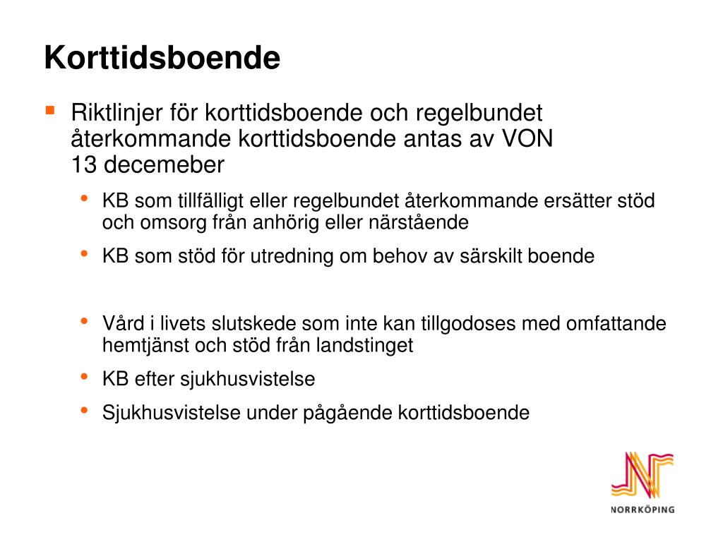 Korttidsboende • Riktlinjer för korttidsboende och regelbundet återkommande korttidsboende antas av VON 13 decemeber • KB som tillfälligt eller regelbundet återkommande ersätter stöd och omsorg från anhörig eller närstående • KB som stöd för utredning om behov av särskilt boende • Vård i livets slutskede som inte kan tillgodoses med omfattande hemtjänst och stöd från landstinget • KB efter sjukhusvistelse • Sjukhusvistelse under pågående korttidsboende