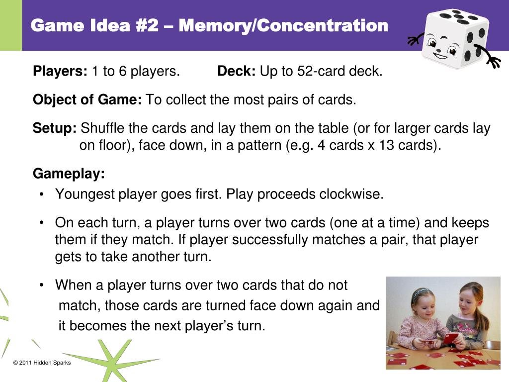 Game Idea #2 – Memory/Concentration Players: 1 to 6 players. Deck: Up to 52-card deck. Object of Game: To collect the most pairs of cards. Setup: Shuffle the cards and lay them on the table (or for larger cards lay on floor), face down, in a pattern (e.g. 4 cards x 13 cards). Gameplay: • Youngest player goes first. Play proceeds clockwise. • On each turn, a player turns over two cards (one at a time) and keeps them if they match. If player successfully matches a pair, that player gets to take another turn. • When a player turns over two cards that do not match, those cards are turned face down again and it becomes the next player’s turn.