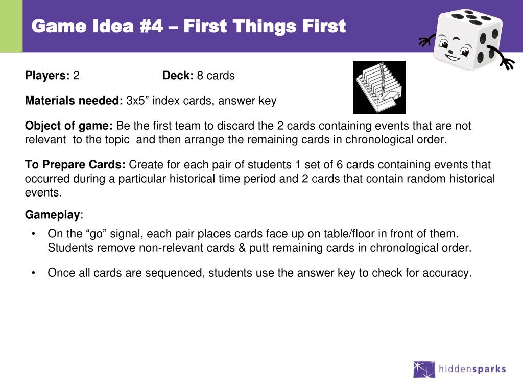 Game Idea #4 – First Things First Players: 2 Deck: 8 cards Materials needed: 3x5” index cards, answer key Object of game: Be the first team to discard the 2 cards containing events that are not relevant to the topic and then arrange the remaining cards in chronological order. To Prepare Cards: Create for each pair of students 1 set of 6 cards containing events that occurred during a particular historical time period and 2 cards that contain random historical events. Gameplay: • On the “go” signal, each pair places cards face up on table/floor in front of them. Students remove non-relevant cards & putt remaining cards in chronological order. • Once all cards are sequenced, students use the answer key to check for accuracy.