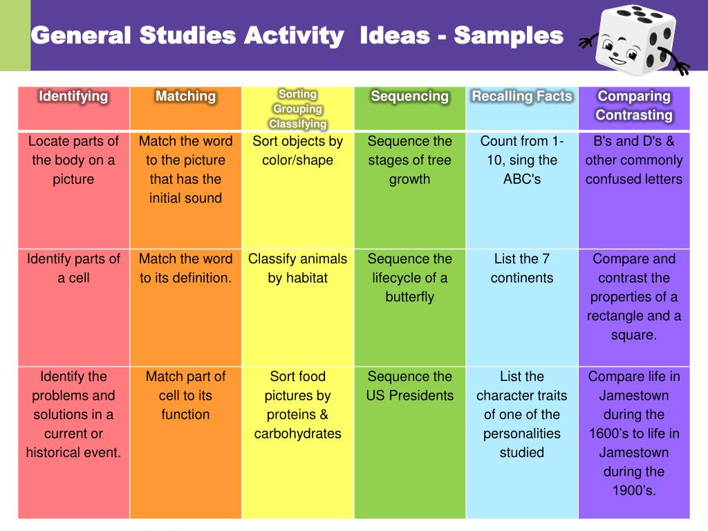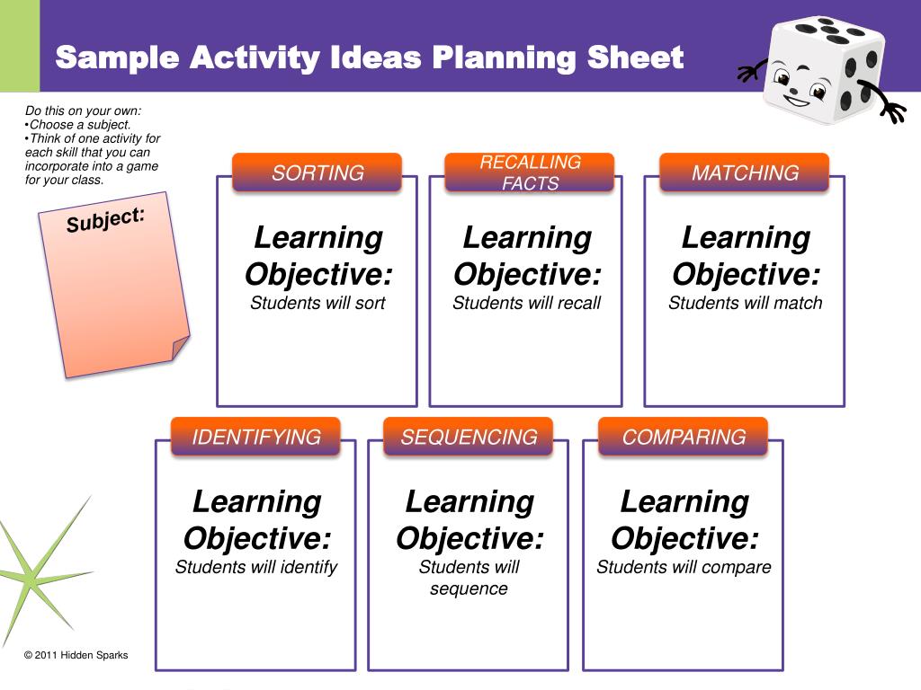 Sample Activity Ideas Planning Sheet • Do this on your own: • Choose a subject. • Think of one activity for each skill that you can incorporate into a game for your class. SORTING RECALLING FACTS MATCHING Learning Objective: Students will sort Learning Objective: Students will recall Learning Objective: Students will match Subject: IDENTIFYING SEQUENCING COMPARING Learning Objective: Students will identify Learning Objective: Students will sequence Learning Objective: Students will compare