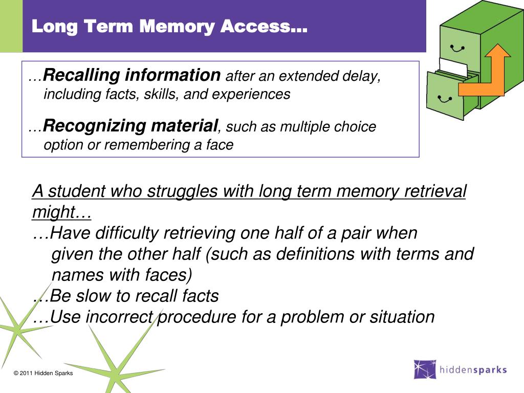 Long Term Memory Access… …Recalling informationafter an extended delay, including facts, skills, and experiences …Recognizing material, such as multiple choice option or remembering a face A student who struggles with long term memory retrieval might… …Have difficulty retrieving one half of a pair when given the other half (such as definitions with terms and names with faces) …Be slow to recall facts …Use incorrect procedure for a problem or situation