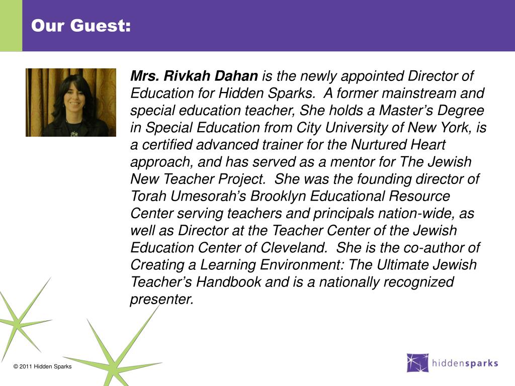 Our Guest: Mrs. RivkahDahanis the newly appointed Director of Education for Hidden Sparks. A former mainstream and special education teacher, She holds a Master’s Degree in Special Education from City University of New York, is a certified advanced trainer for the Nurtured Heart approach, and has served as a mentor for The Jewish New Teacher Project. She was the founding director of Torah Umesorah’s Brooklyn Educational Resource Center serving teachers and principals nation-wide, as well as Director at the Teacher Center of the Jewish Education Center of Cleveland. She is the co-author of Creating a Learning Environment: The Ultimate Jewish Teacher’s Handbook and is a nationally recognized presenter.