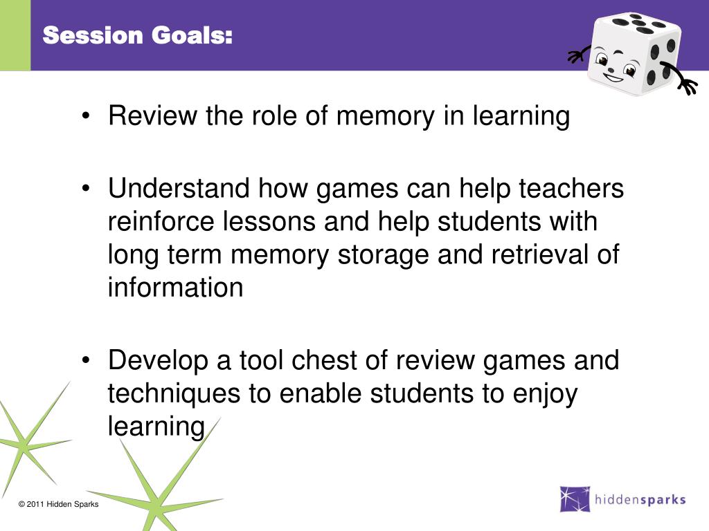 Session Goals: • Review the role of memory in learning • Understand how games can help teachers reinforce lessons and help students with long term memory storage and retrieval of information • Develop a tool chest of review games and techniques to enable students to enjoy learning
