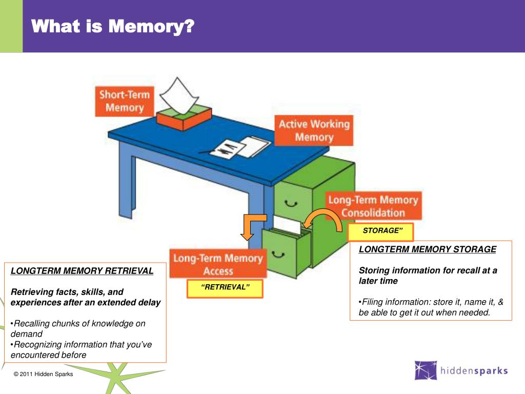 What is Memory? “STORAGE” • LONGTERM MEMORY STORAGE • Storing information for recall at a later time • Filing information: store it, name it, & be able to get it out when needed. “RETRIEVAL” • LONGTERM MEMORY RETRIEVAL • Retrieving facts, skills, and experiences after an extended delay • Recalling chunks of knowledge on demand • Recognizing information that you’ve encountered before