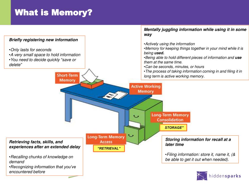 What is Memory? • Mentally juggling information while using it in some way • Actively using the information • Memory for keeping things together in your mind while it is being used. • Being able to hold different pieces of information and use them at the same time. • Can be seconds, minutes, or hours • The process of taking information coming in and filing it in long term is active working memory. • Briefly registering new information • Only lasts for seconds • A very small space to hold information • You need to decide quickly “save or delete” “STORAGE” • Storing information for recall at a later time • Filing information: store it, name it, (& be able to get it out when needed). • Retrieving facts, skills, and experiences after an extended delay • Recalling chunks of knowledge on demand • Recognizing information that you’ve encountered before “RETRIEVAL”