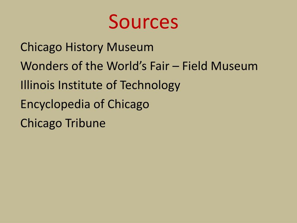 Sources Chicago History Museum Wonders of the World’s Fair – Field Museum Illinois Institute of Technology Encyclopedia of Chicago Chicago Tribune