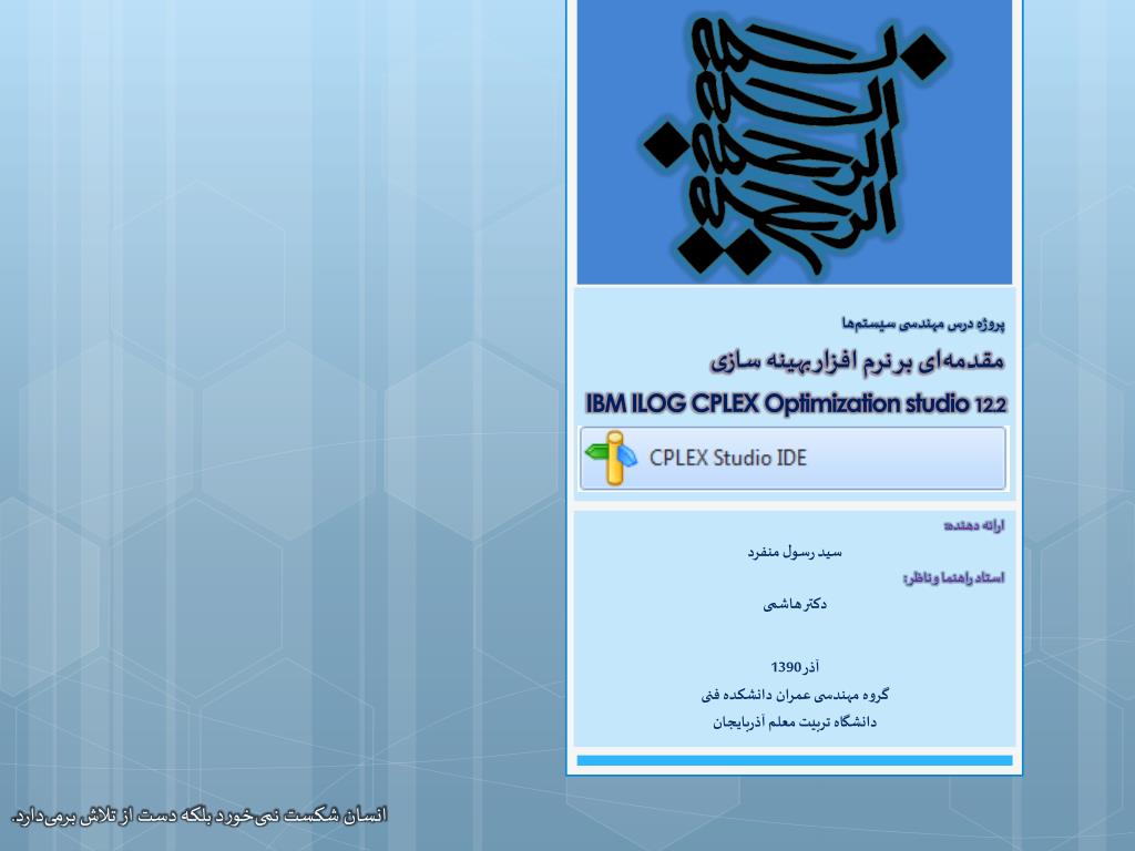 ارائه دهنده: سید رسول منفرد استاد راهنما و ناظر: دکتر هاشمی آذر 1390 گروه مهندسی عمران دانشکده فنی دانشگاه تربیت معلم آذربایجان. پروژه درس مهندسی سیستمها مقدمهای بر نرم افزار بهینه سازی IBM ILOG CPLEX Optimization studio 12.2. انسان شکست نمیخورد بلکه دست از تلاش برمیدارد.