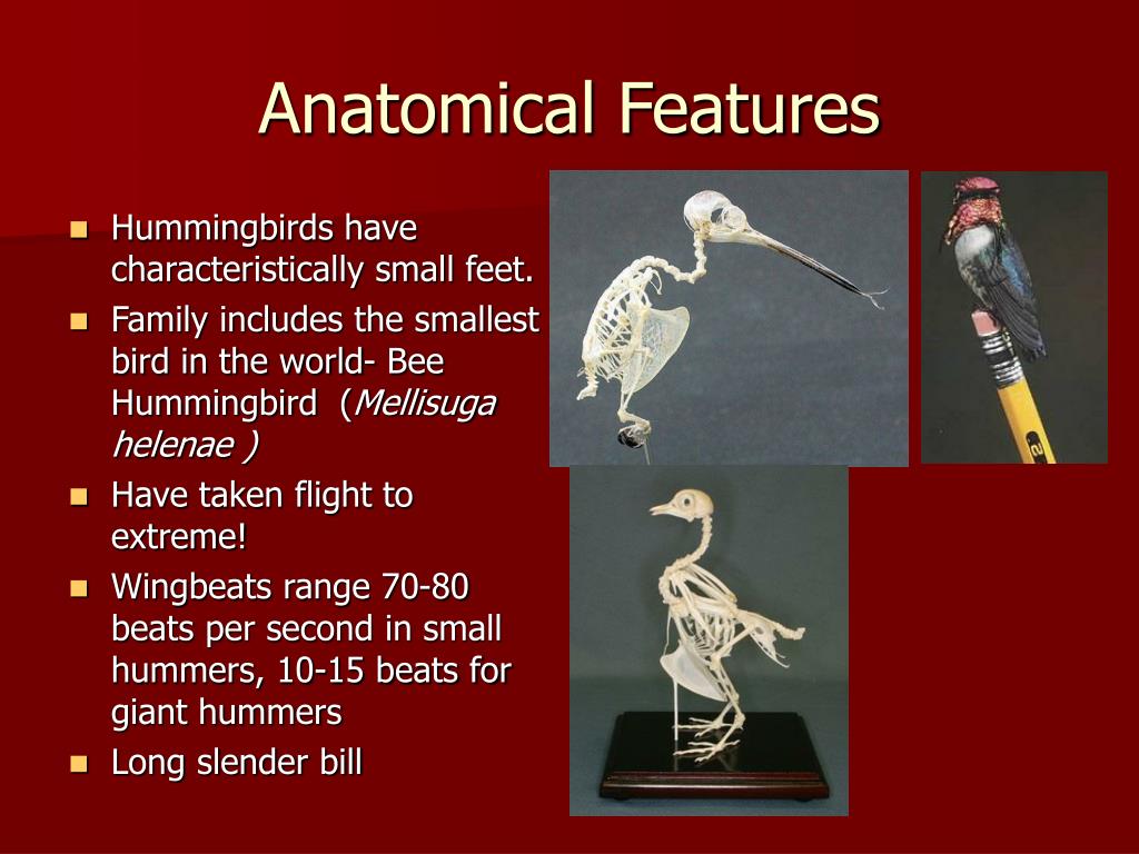 Anatomical Features Hummingbirds have characteristically small feet. Family includes the smallest bird in the world- Bee Hummingbird (Mellisuga helenae ) Have taken flight to extreme! Wingbeats range 70-80 beats per second in small hummers, 10-15 beats for giant hummers Long slender bill
