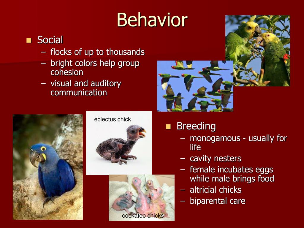Breeding monogamous - usually for life cavity nesters female incubates eggs while male brings food altricial chicks biparental care Social flocks of up to thousands bright colors help group cohesion visual and auditory communication Behavior eclectus chick cockatoo chicks