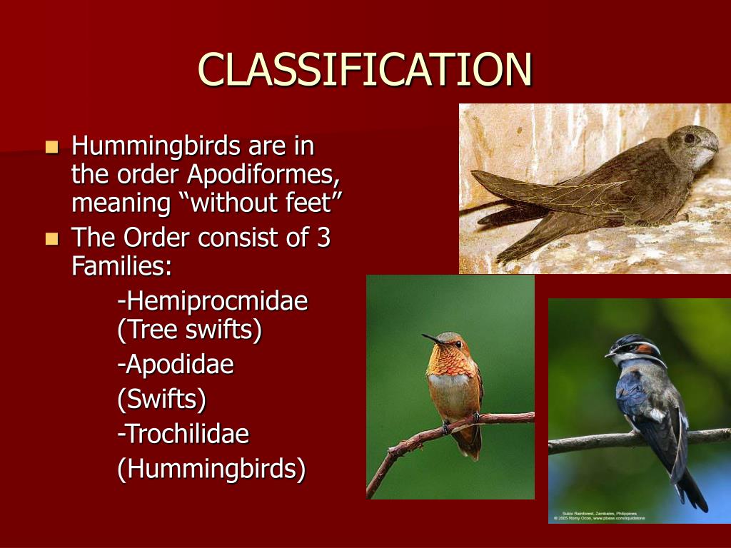 CLASSIFICATION Hummingbirds are in the order Apodiformes, meaning “without feet” The Order consist of 3 Families: -Hemiprocmidae (Tree swifts) -Apodidae (Swifts) -Trochilidae (Hummingbirds)