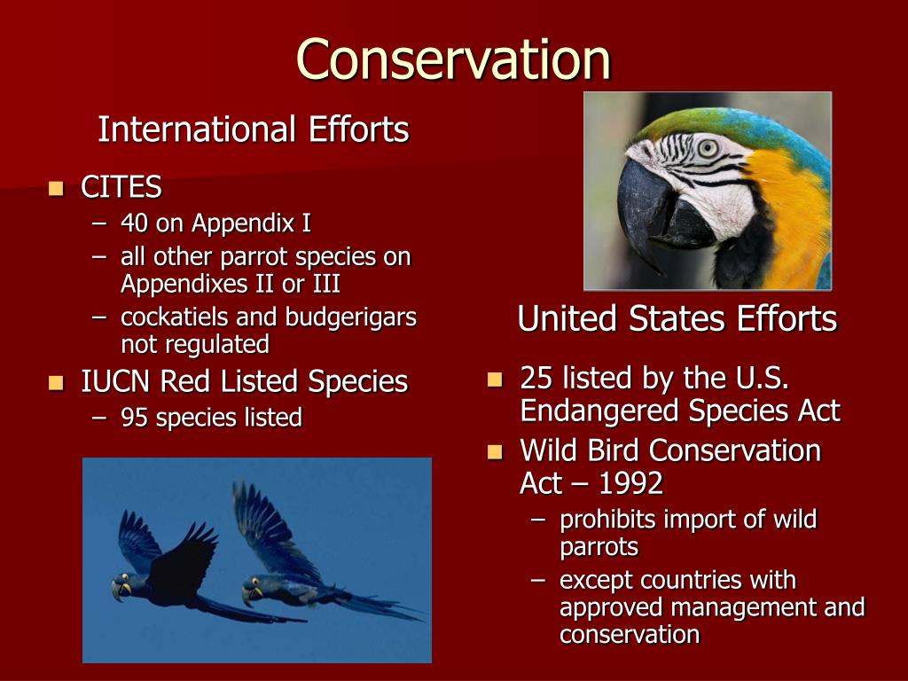 United States Efforts 25 listed by the U.S. Endangered Species Act Wild Bird Conservation Act – 1992 prohibits import of wild parrots except countries with approved management and conservation Conservation International Efforts • CITES • 40 on Appendix I • all other parrot species on Appendixes II or III • cockatiels and budgerigars not regulated • IUCN Red Listed Species • 95 species listed
