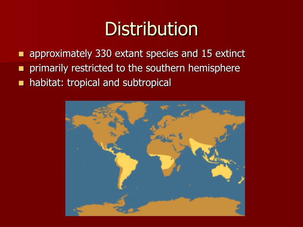 Distribution • approximately 330 extant species and 15 extinct • primarily restricted to the southern hemisphere • habitat: tropical and subtropical