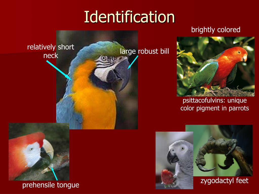 Identification brightly colored relatively short neck large robust bill psittacofulvins: unique color pigment in parrots zygodactyl feet prehensile tongue
