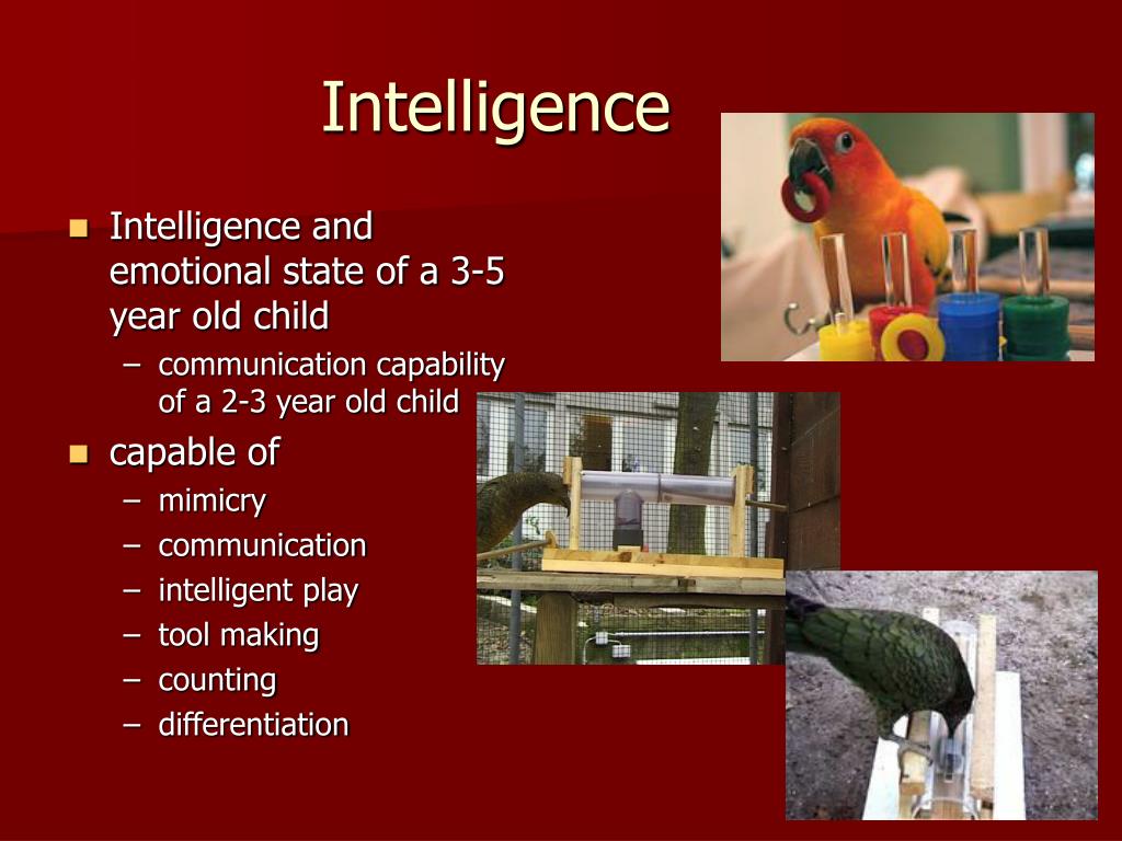 Intelligence • Intelligence and emotional state of a 3-5 year old child • communication capability of a 2-3 year old child • capable of • mimicry • communication • intelligent play • tool making • counting • differentiation