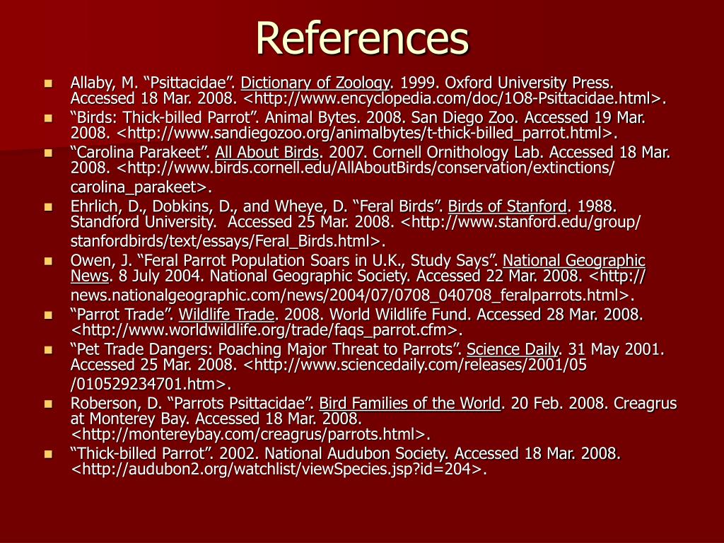 References • Allaby, M. “Psittacidae”. Dictionary of Zoology. 1999. Oxford University Press. Accessed 18 Mar. 2008. <http://www.encyclopedia.com/doc/1O8-Psittacidae.html>. • “Birds: Thick-billed Parrot”. Animal Bytes. 2008. San Diego Zoo. Accessed 19 Mar. 2008. <http://www.sandiegozoo.org/animalbytes/t-thick-billed_parrot.html>. • “Carolina Parakeet”. All About Birds. 2007. Cornell Ornithology Lab. Accessed 18 Mar. 2008. <http://www.birds.cornell.edu/AllAboutBirds/conservation/extinctions/ carolina_parakeet>. • Ehrlich, D., Dobkins, D., and Wheye, D. “Feral Birds”. Birds of Stanford. 1988. Standford University. Accessed 25 Mar. 2008. <http://www.stanford.edu/group/ stanfordbirds/text/essays/Feral_Birds.html>. • Owen, J. “Feral Parrot Population Soars in U.K., Study Says”. National Geographic News. 8 July 2004. National Geographic Society. Accessed 22 Mar. 2008. <http:// news.nationalgeographic.com/news/2004/07/0708_040708_feralparrots.html>. • “Parrot Trade”. Wildlife Trade. 2008. World Wildlife Fund. Accessed 28 Mar. 2008. <http://www.worldwildlife.org/trade/faqs_parrot.cfm>. • “Pet Trade Dangers: Poaching Major Threat to Parrots”. Science Daily. 31 May 2001. Accessed 25 Mar. 2008. <http://www.sciencedaily.com/releases/2001/05 /010529234701.htm>. • Roberson, D. “Parrots Psittacidae”. Bird Families of the World. 20 Feb. 2008. Creagrus at Monterey Bay. Accessed 18 Mar. 2008. <http://montereybay.com/creagrus/parrots.html>. • “Thick-billed Parrot”. 2002. National Audubon Society. Accessed 18 Mar. 2008. <http://audubon2.org/watchlist/viewSpecies.jsp?id=204>.