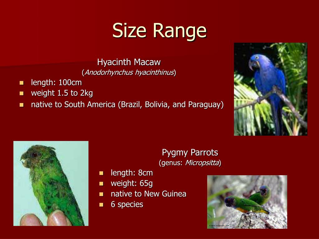 Hyacinth Macaw (Anodorhynchus hyacinthinus) length: 100cm weight 1.5 to 2kg native to South America (Brazil, Bolivia, and Paraguay) Pygmy Parrots (genus: Micropsitta) length: 8cm weight: 65g native to New Guinea 6 species Size Range