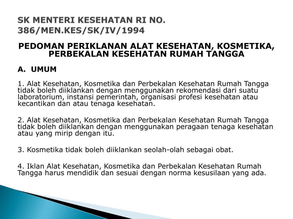 SK MENTERI KESEHATAN RI NO. 386/MEN.KES/SK/IV/1994 PEDOMAN PERIKLANAN ALAT KESEHATAN, KOSMETIKA, PERBEKALAN KESEHATAN RUMAH TANGGA A. UMUM 1. AlatKesehatan, KosmetikadanPerbekalanKesehatanRumahTanggatidakbolehdiiklankandenganmenggunakanrekomendasidarisuatulaboratorium, instansipemerintah, organisasiprofesikesehatanataukecantikandanatautenagakesehatan. 2. AlatKesehatan, KosmetikadanPerbekalanKesehatanRumahTanggatidakbolehdiiklankandenganmenggunakanperagaantenagakesehatanatau yang miripdenganitu. 3. Kosmetikatidakbolehdiiklankanseolah-olahsebagaiobat. 4. IklanAlatKesehatan, KosmetikadanPerbekalanKesehatanRumahTanggaharusmendidikdansesuaidengannormakesusilaan yang ada.