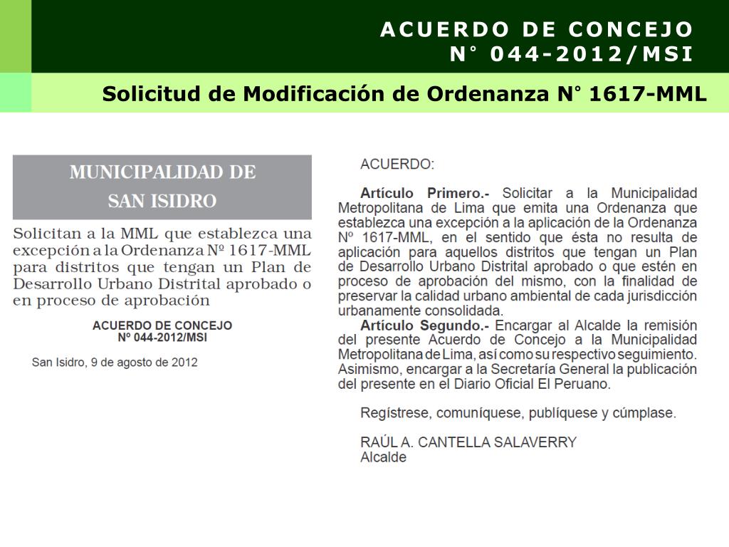 ACUERDO DE CONCEJO N° 044-2012/MSI Solicitud de Modificación de Ordenanza N° 1617-MML