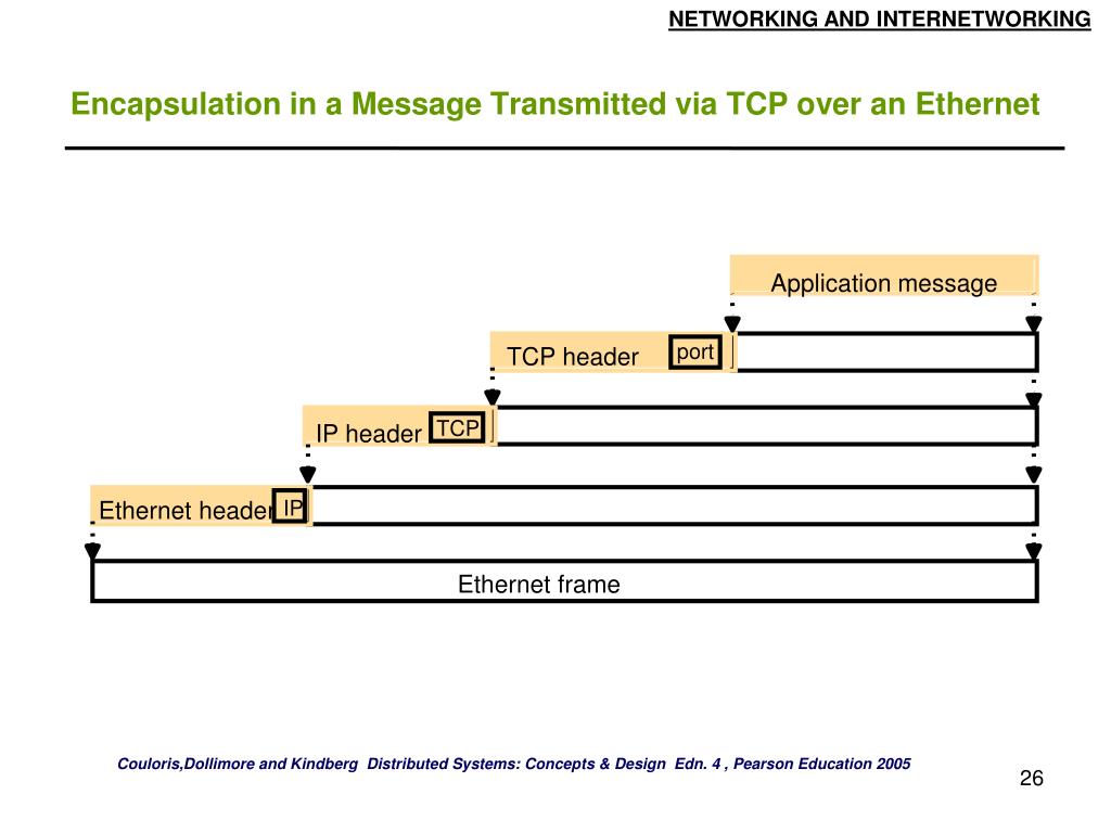 Application message port TCP header TCP IP header Ethernet header IP Ethernet frame Encapsulation in a Message Transmitted via TCP over an Ethernet Couloris,Dollimore and Kindberg Distributed Systems: Concepts & Design Edn. 4 , Pearson Education 2005