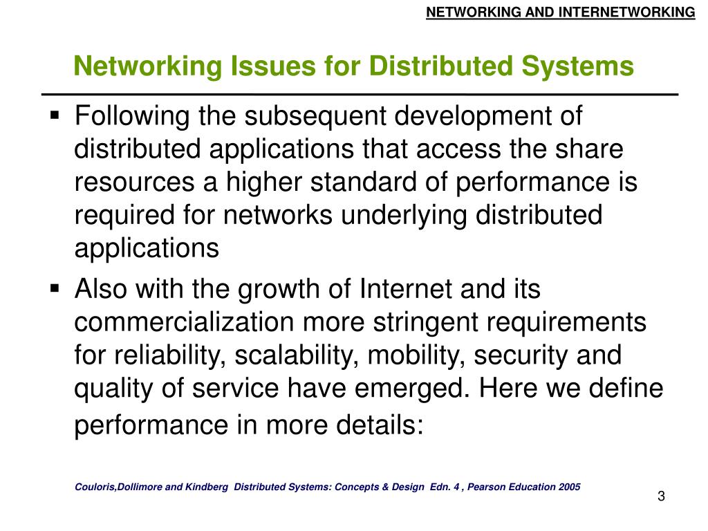 Following the subsequent development of distributed applications that access the share resources a higher standard of performance is required for networks underlying distributed applications • Also with the growth of Internet and its commercialization more stringent requirements for reliability, scalability, mobility, security and quality of service have emerged. Here we define performance in more details: Networking Issues for Distributed Systems Couloris,Dollimore and Kindberg Distributed Systems: Concepts & Design Edn. 4 , Pearson Education 2005