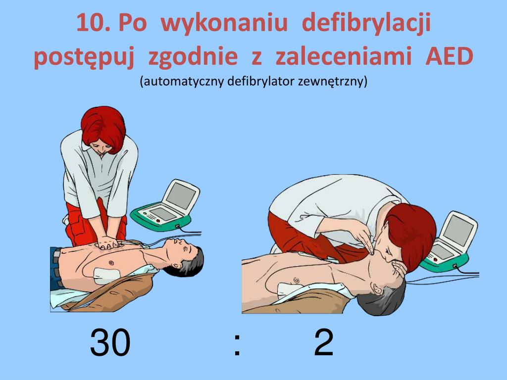 10. Po wykonaniu defibrylacji postępuj zgodnie z zaleceniami AED (automatyczny defibrylator zewnętrzny) 30:2