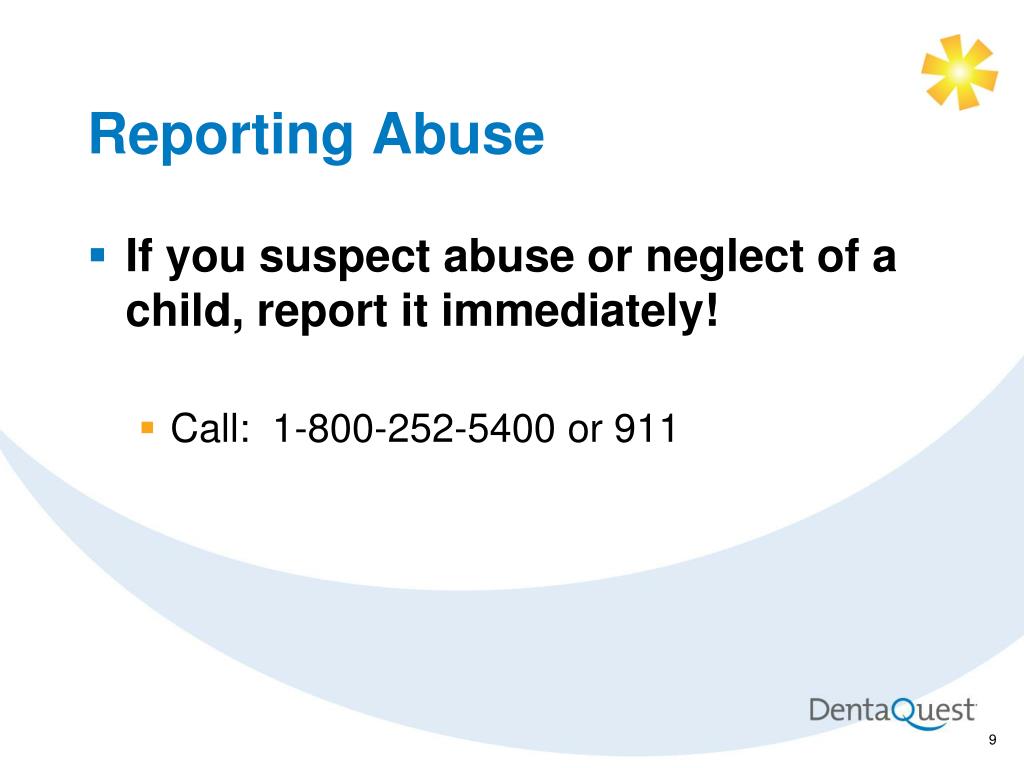 Reporting Abuse • If you suspect abuse or neglect of a child, report it immediately! • Call: 1-800-252-5400 or 911
