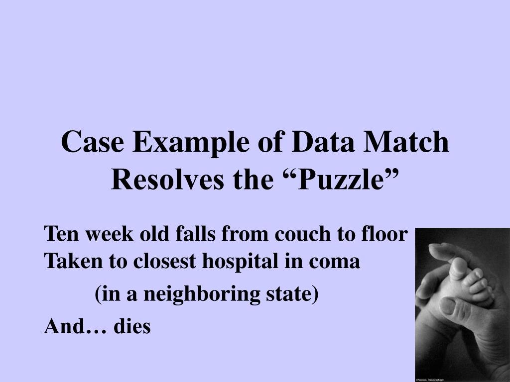 Case Example of Data MatchResolves the “Puzzle” Ten week old falls from couch to floor Taken to closest hospital in coma (in a neighboring state) And… dies