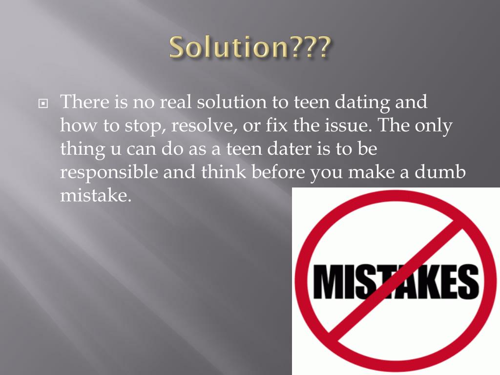 Solution??? • There is no real solution to teen dating and how to stop, resolve, or fix the issue. The only thing u can do as a teen dater is to be responsible and think before you make a dumb mistake.