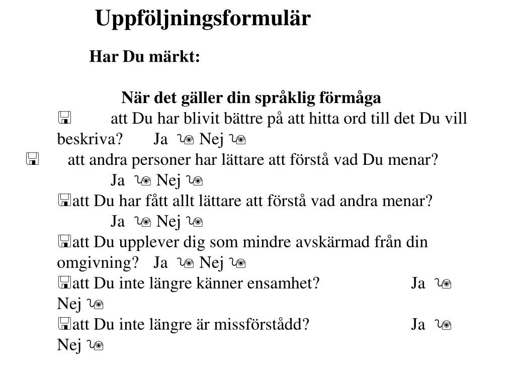 Uppföljningsformulär • Har Du märkt: • När det gäller din språklig förmåga • < att Du har blivit bättre på att hitta ord till det Du vill beskriva? Ja 9 Nej 9 • < att andra personer har lättare att förstå vad Du menar? Ja 9 Nej 9 • att Du har fått allt lättare att förstå vad andra menar? Ja 9 Nej 9 • att Du upplever dig som mindre avskärmad från din omgivning? Ja 9 Nej 9 • att Du inte längre känner ensamhet? Ja 9 Nej 9 • att Du inte längre är missförstådd? Ja 9 Nej 9